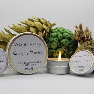 Naranja y Chocolate: Contiene Cera de Soja, Manteca de Karité, Aceite de Almendras dulces, Aceite esencial de Naranja y Fragancia de Chocolate.